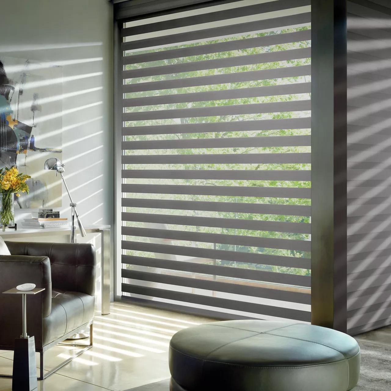 Zebra shades feature alternating sheer and solid fabric bands that let you transition seamlessly between privacy and an open view with a simple adjustment.